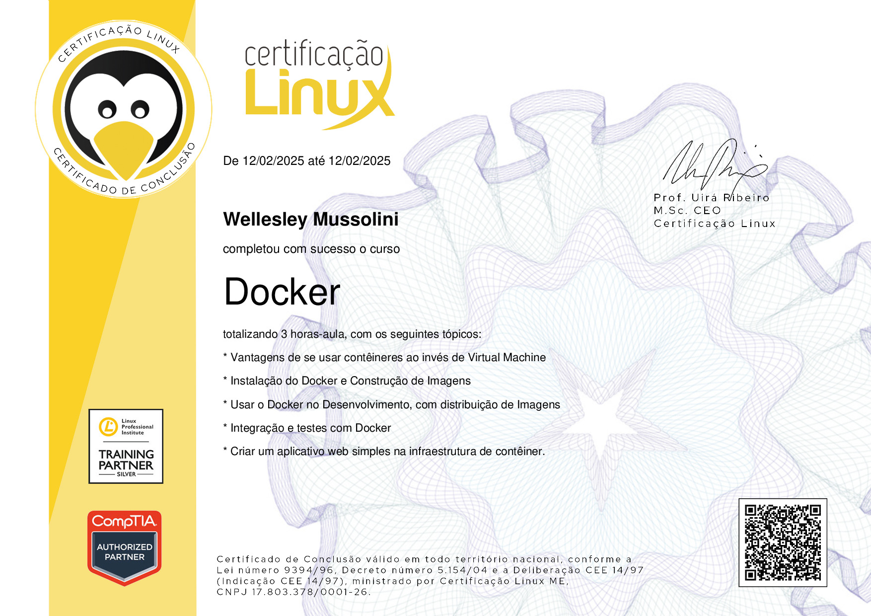 A conta de Wellesley Mussolini é verificada e certificamos para os devidos fins, conforme a Lei número 9394/96, o Decreto número 5.154/04 e a Deliberação CEE 14/97 (Indicação CEE 14/97), que ele concluiu o curso Docker, ministrado pelo prof. Uirá Endy Ribeiro.