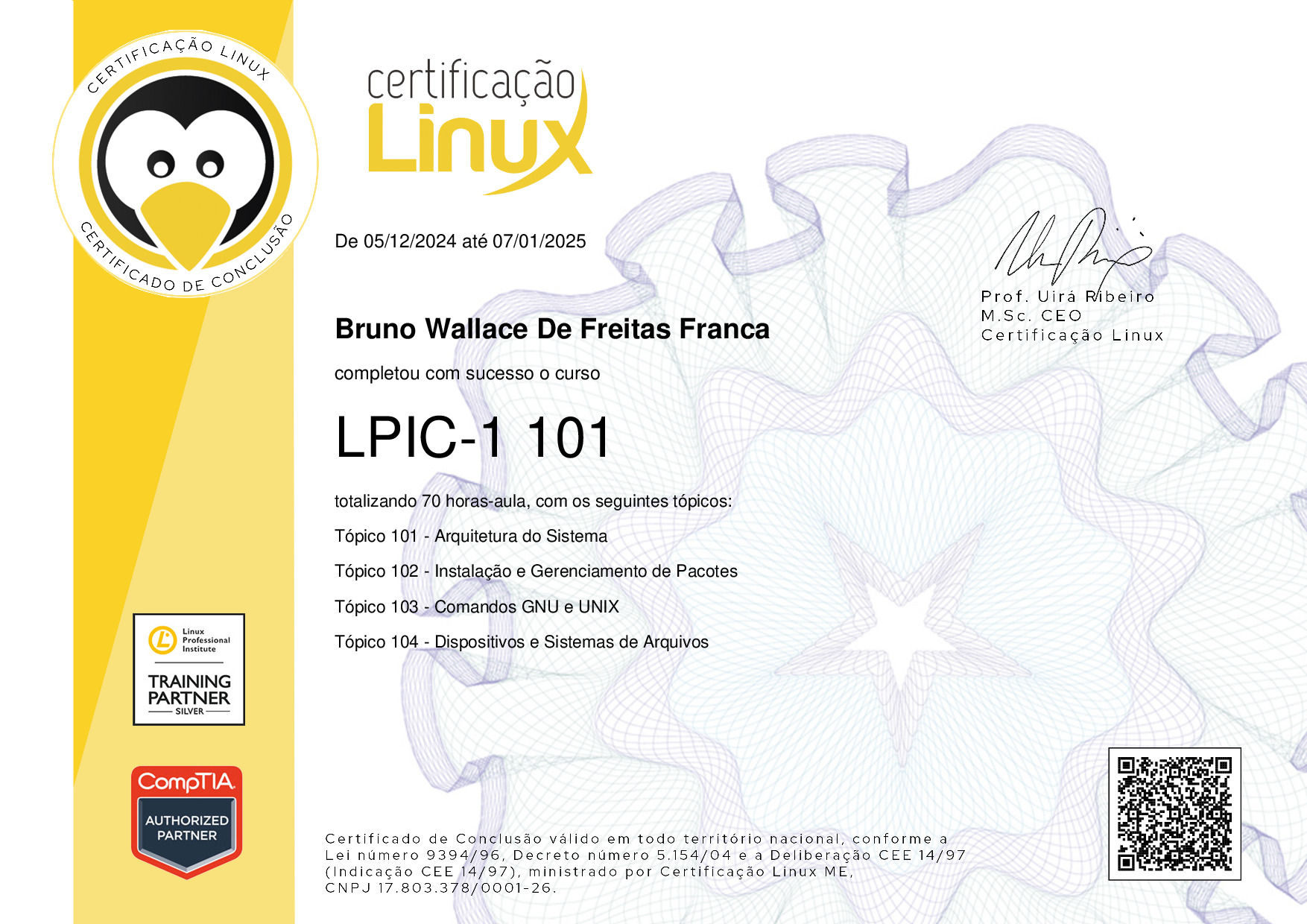 A conta de BRUNO WALLACE DE FREITAS FRANCA é verificada e certificamos para os devidos fins, conforme a Lei número 9394/96, o Decreto número 5.154/04 e a Deliberação CEE 14/97 (Indicação CEE 14/97), que ele concluiu o curso LPIC-1 101, ministrado pelo prof. Uirá Endy Ribeiro.